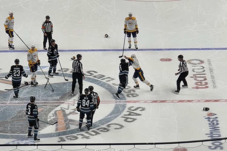 KOMPAS.com/ Galuh Putri Riyanto Detail yang ditangkap oleh kamera telefoto Samsung S25 Ultra memperlihatkan wajah pemain dan wasit setelah gelut. Foto ini kami ambil dari bangku tribun paling atas stadium SAP Center,San Joser,California di pertandingan Hoki antara San Jose Sharks vs Nashville Predators.