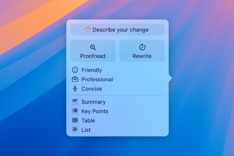 Kemudian,pengguna juga bisa menulis ulang teks (rewrite) yang terseleksi dengan tone dan bahasa yang baru. Selanjutnya,Writing Tools juga memungkinkan pengguna untuk merangkum (summarize) secara otomatis konten teks yang terseleksi.
