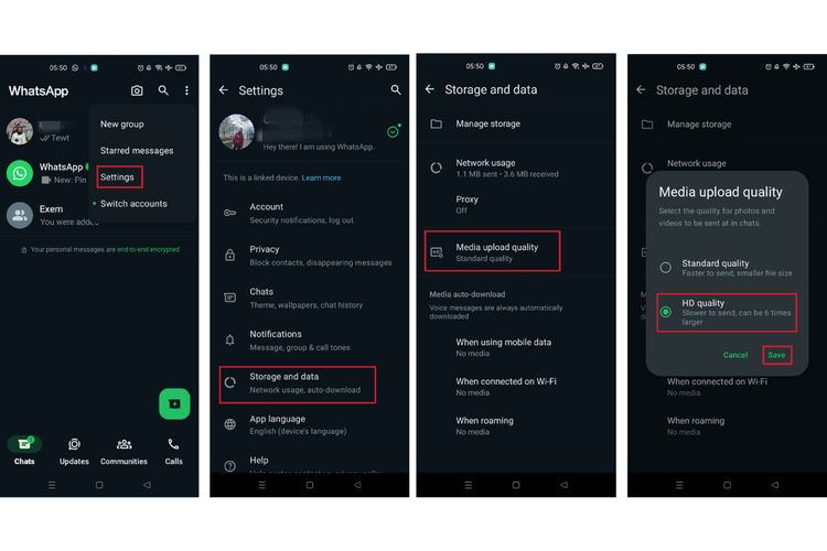 KOMPAS.com/ Galuh Putri Riyanto Cara atur HD quality secara deafault agar kirim foto/ video auto-HD di WhatsApp.