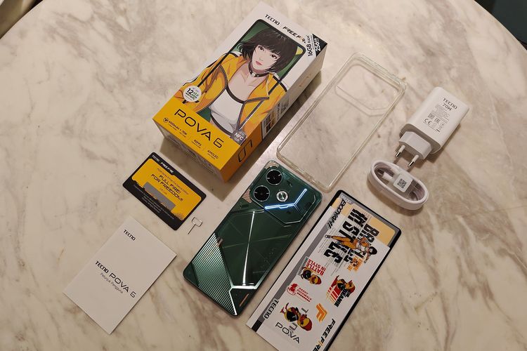 KOMPAS.com/Bill Clinten Tampilan isi kotak penjualan Tecno Pova 6. Ponsel ini akan dirilis pada 13 Juni mendatang.