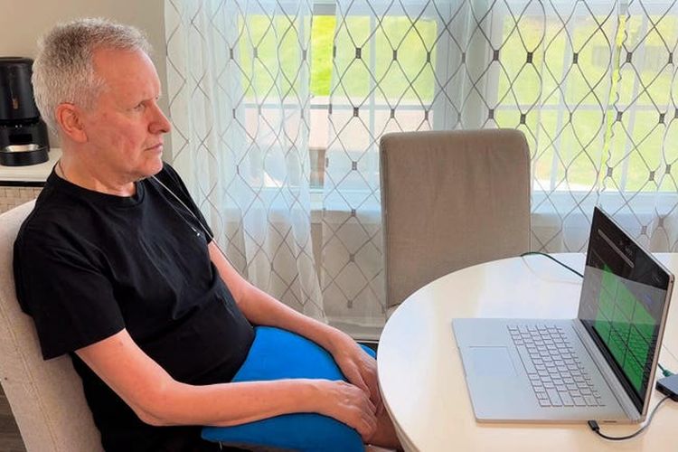 CNET Salah satu pasien Synchron yang sedang mendemonstrasikan chip otak yang sudah dibekali dengan ChatGPT.