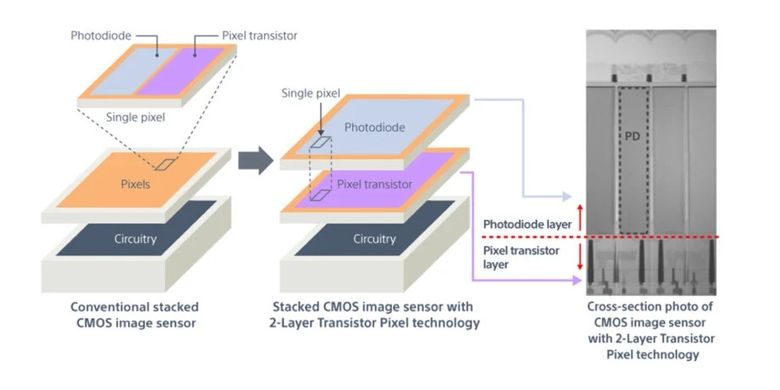 Sony Ilustrasi konstruksi sensor 2-Layer Transistor Pixel dari Sony (kanan) dibanding sensor stacked CMOS konvensional