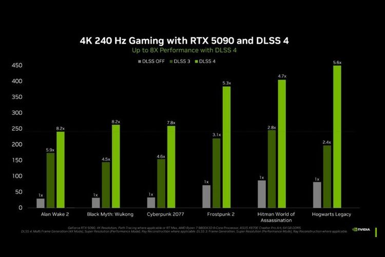 Secara keseluruhan,Nvidia mengeklaim DLSS 4 dapat meningkatkan performa game ketika dimainkan di kualitas 4K dengan layar refresh rate 240 Hz.