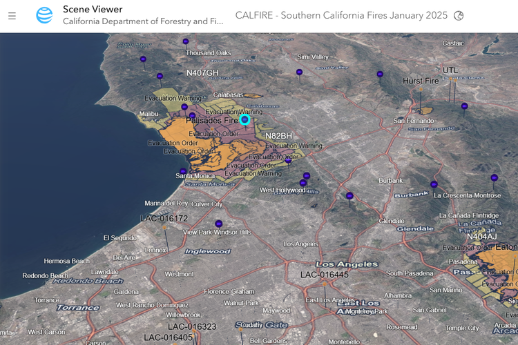 Dalam peta ini,terdapat area "Calfire" yang bisa menampilkan kebakaran yang melanda sejumlah area di Los Angeles.