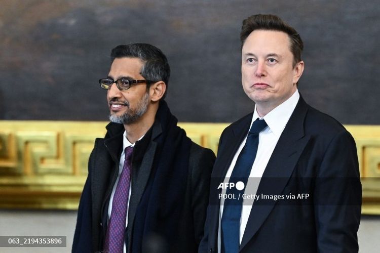 POOL/GETTY IMAGES NORTH AMERICA/GETTY IMAGES VIA AFP CEO Google Sundar Pichai (kiri) bersama CEO Tesla dan SpaceX Elon Musk pada pelantikan Donald Trump sebagai Presiden Amerika Serikat di US Capitol,Washington DC,Senin (20/1/2025).