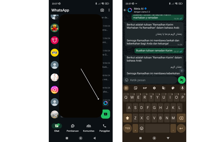Meta AI yang terintegrasi di WhatsApp bisa menjadi solusi cepat untuk membuat tulisan Arab tanpa perlu aplikasi tambahan. Dengan fitur ini,Anda bisa langsung meminta bantuan AI untuk menerjemahkan teks dari bahasa Indonesia ke Arab dalam chat WhatsApp. Berikut langkah-langkahnya: