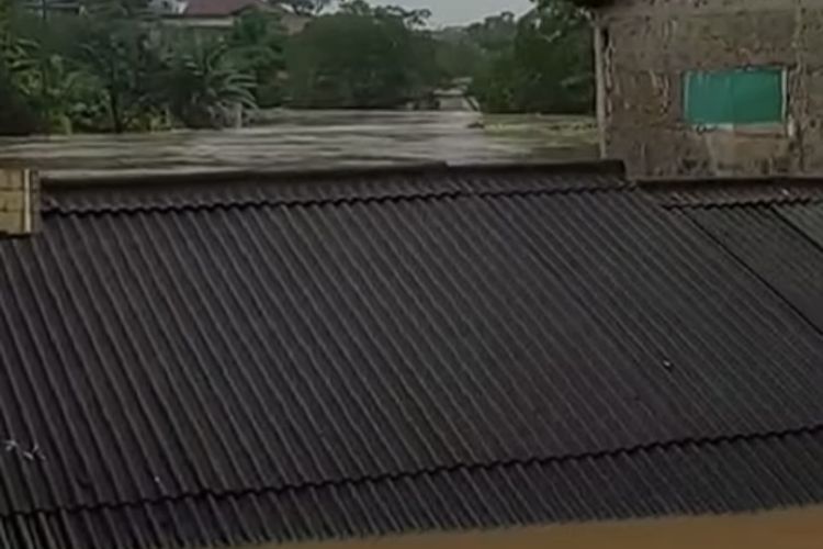 Ketinggian air cukup tinggi dan menenggelamkan rumah-rumah warga hingga hanya terlihat atapnya.