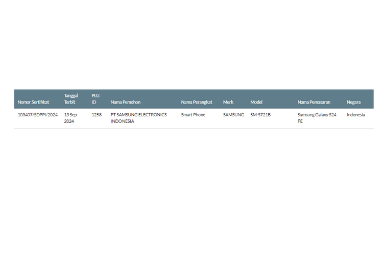 Sertifikat itu ditujukan untuk ponsel dengan nomor model "SM-S721B" dengan nama pemasaran "Samsung Galaxy S24 FE".