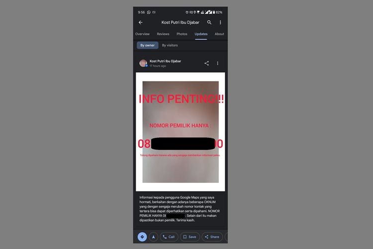 Dengan rutin mengecek Maps,pemilik bisnis asli juga bisa lebih cepat tanggap dalam memperbaiki atau menghapus kontak palsu maupun informasi palsu lainnya yang disematkan oleh penipu.