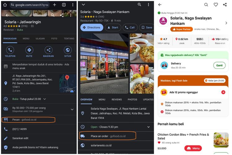 Kompas.com/BILL CLINTEN Menu pesan makanan GoFood di Google Search (kiri) dan Maps (tengah).