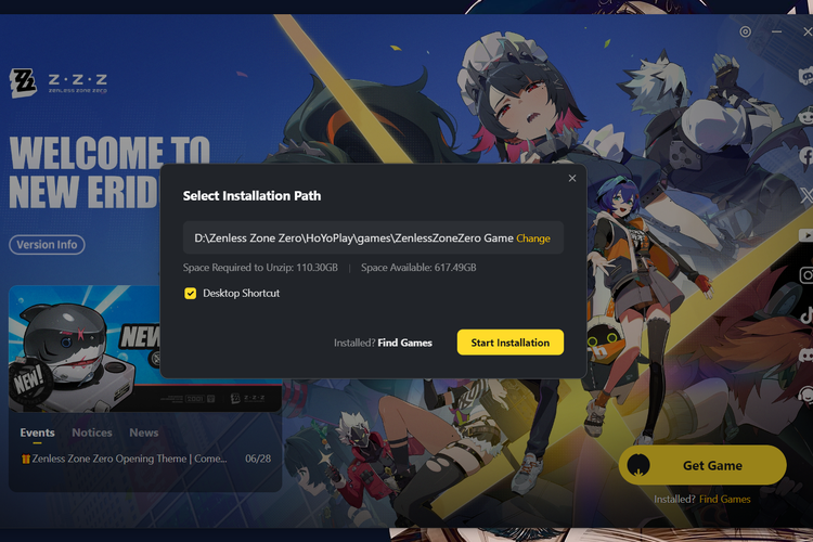 Gamer PC mesti mengunduh launcher-nya terlebih dahulu baik di situs resmi ZZZ maupun di platform distribusi Epic Games. Setelah itu,buka launcher,pilih lokasi download game,dan pilih "Get Game" seperti yang terlihat dalam gambar di bawah ini.