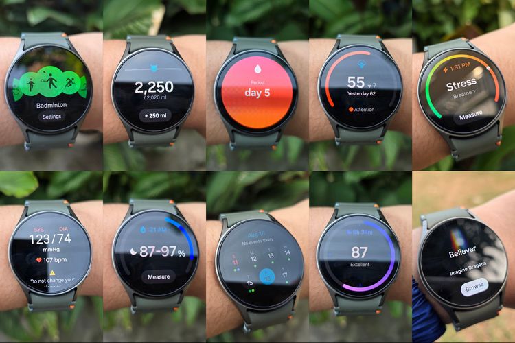 KOMPAS.com/ Galuh Putri Riyanto Deretan fitur kesehatan dan kebugaran di Galaxy Watch 7. Mulai dari workout routine,pelacakan asupan air putih,siklus menstruasi,Energy Score,level stres,cek tensi,cek saturasi oksigen,liat jadwal harian,pantauan tidur,media kontroler.