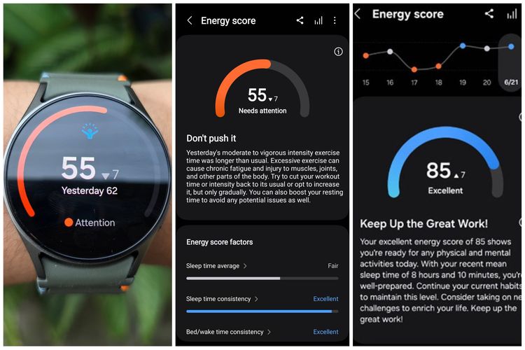 Salah satu fitur yang didukung Galaxy AI adalah Energy Score. Fitur Energy Score mencerminkan tingkat energi pengguna yang dihitung berdasarkan kualitas tidur,detak jantung ketika tidur,dan aktivitas fisik yang dilakukan di hari sebelumnya.