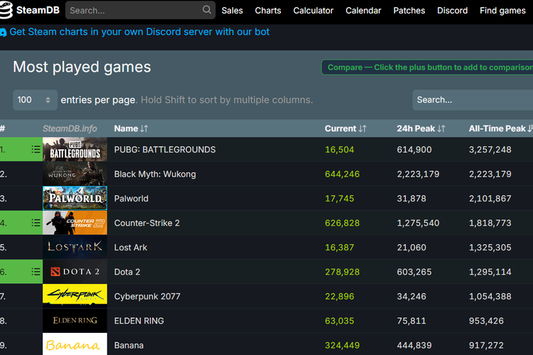 SteamDB Daftar game dengan jumlah pemain bersamaan terbanyak bisa dilihat di menu All-Time Peak. Terlihat bahwa Black Myth: Wukong menduduki posisi kedua di atas Palworld,Counter-Strike 2,Lost Ark,Dota 2,dan lain-lain.