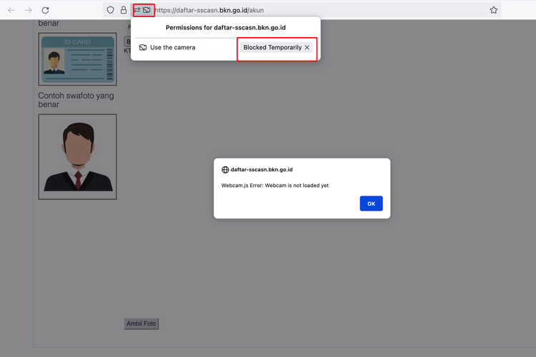 KOMPAS.com/Zulfikar Hardiansyah Ilustrasi cara mengatasi webcam.js error webcam is not loaded yet pada Mozilla di SSCASN saat swafoto daftar CPNS 2024.