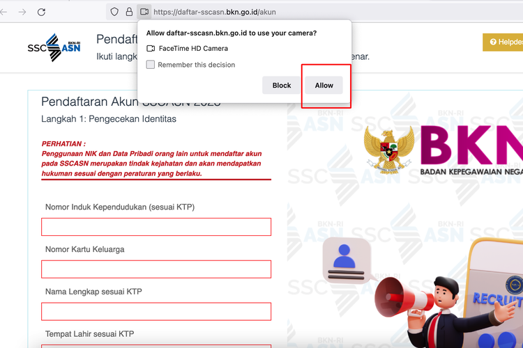 Saat mengakses website sscasn.bkn.go.id dan membuka menu pembuatan akun,aplikasi browser bakal otomatis memunculkan pop up menu yang berisi pengaturan izin akses webcam pada website SSCASN.