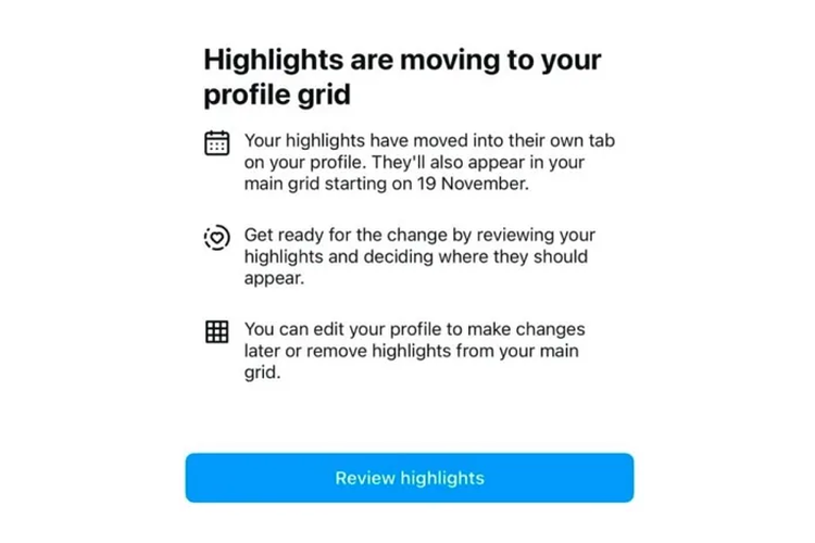 Penggiat media sosial Lindsey Gamble sempat membagikan tangkapan layar notifikasi pemberitahuan pemindahan Highlights ke grid profil.